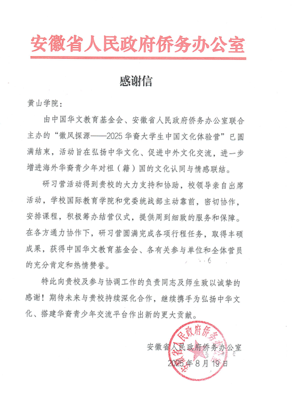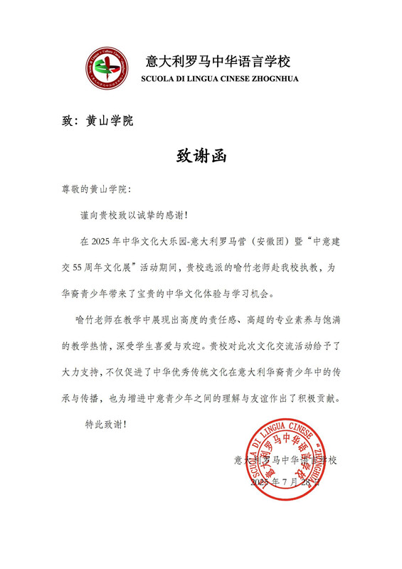 近日,安徽省人民政府侨务办公室和意大利罗马中华语言学校分别向我校发来感谢信,感谢我校在“徽风探源—2025华裔大学生中国文化体验营”和2025年中华文化大乐园—意大利罗马营(安徽团)暨“中意建交55周年文化展”活动期间所作的积极贡献。