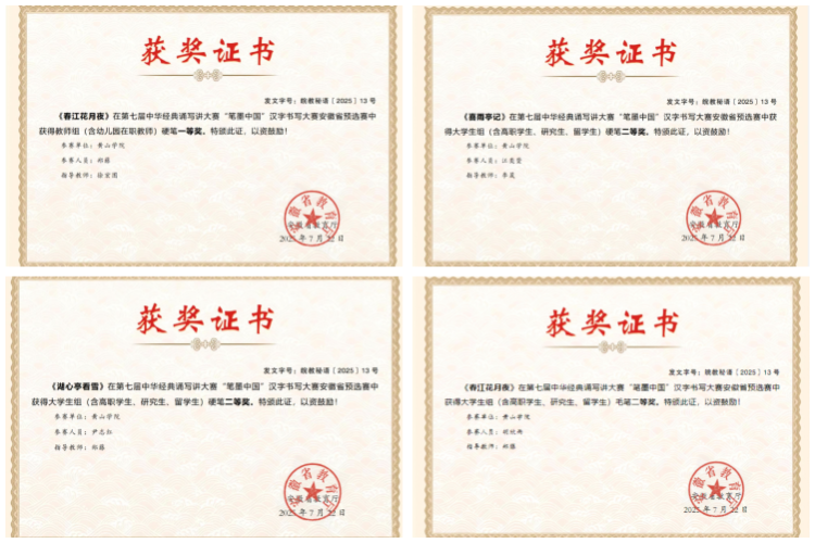 近日,由安徽省教育厅、安徽省语言文字工作委员会联合主办的第七届中华经典诵写讲大赛暨“笔墨中国”汉字书写大赛安徽省预选赛落幕。我校师生表现亮眼,取得一等奖1项、二等奖4项、三等奖1项,省级指导教师奖1项。