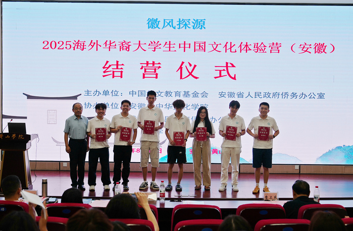 8月13 日,由中国华文教育基金会、安徽省人民政府侨务办公室主办的“徽风探源——2025海外华裔大学生中国文化体验营(安徽)”活动一行41人到访我校。来自美国、英国、法国、加拿大、德国等12个国家的华裔大学生,通过丰富多元的文化实践活动,深度领略徽州文化的独特魅力。校党委委员、副院长张小明,安徽省侨办侨务处处长李鸿雅,黄山市侨办主任曹卫东等,与我校国际教育学院部分来华留学生共同参加体验活动并出席结营仪式。结营仪式由我校国际教育学院负责人主持。
