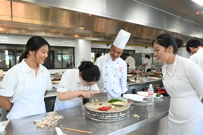 活动当天,华裔大学生们在旅游学院体验徽菜制作技艺。来自美国的郑天宇难掩兴奋:“亲手制作徽菜,才真正领悟到其中的文化内涵,食材间的巧妙搭配,呈现出中国人的生活智慧。”