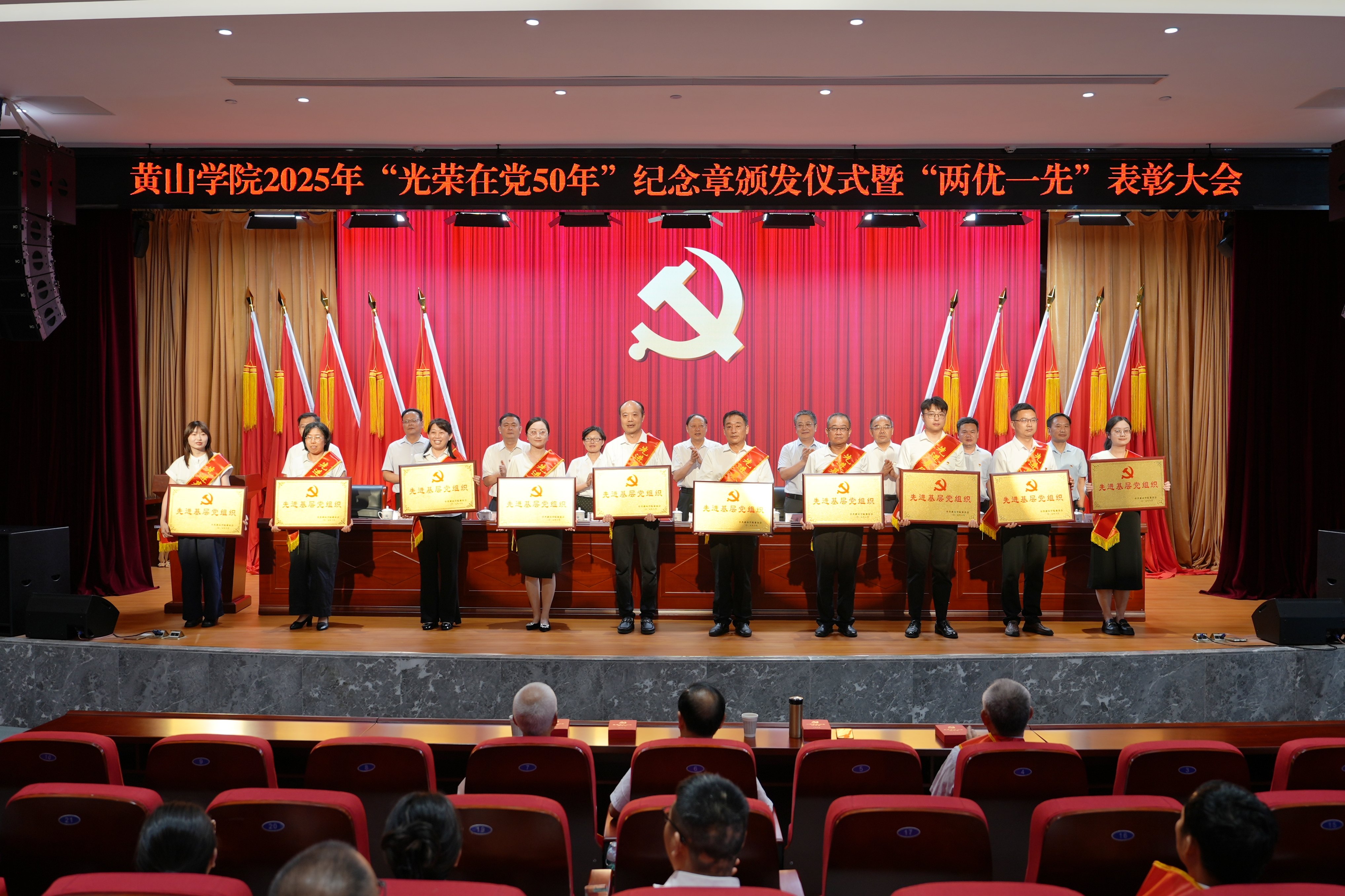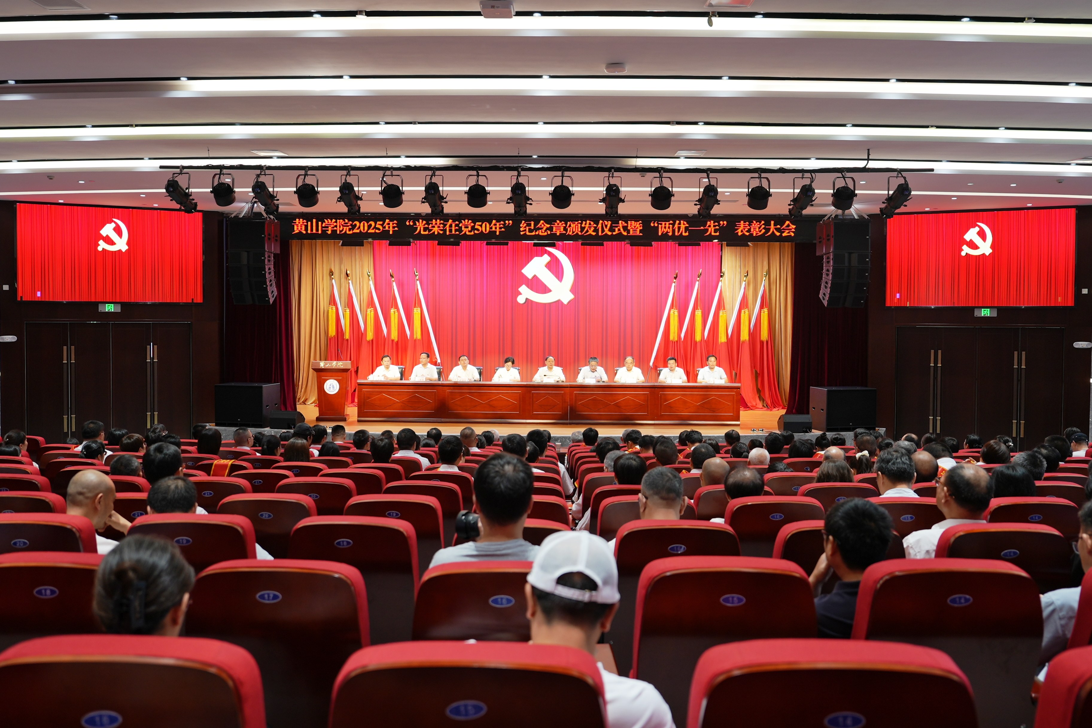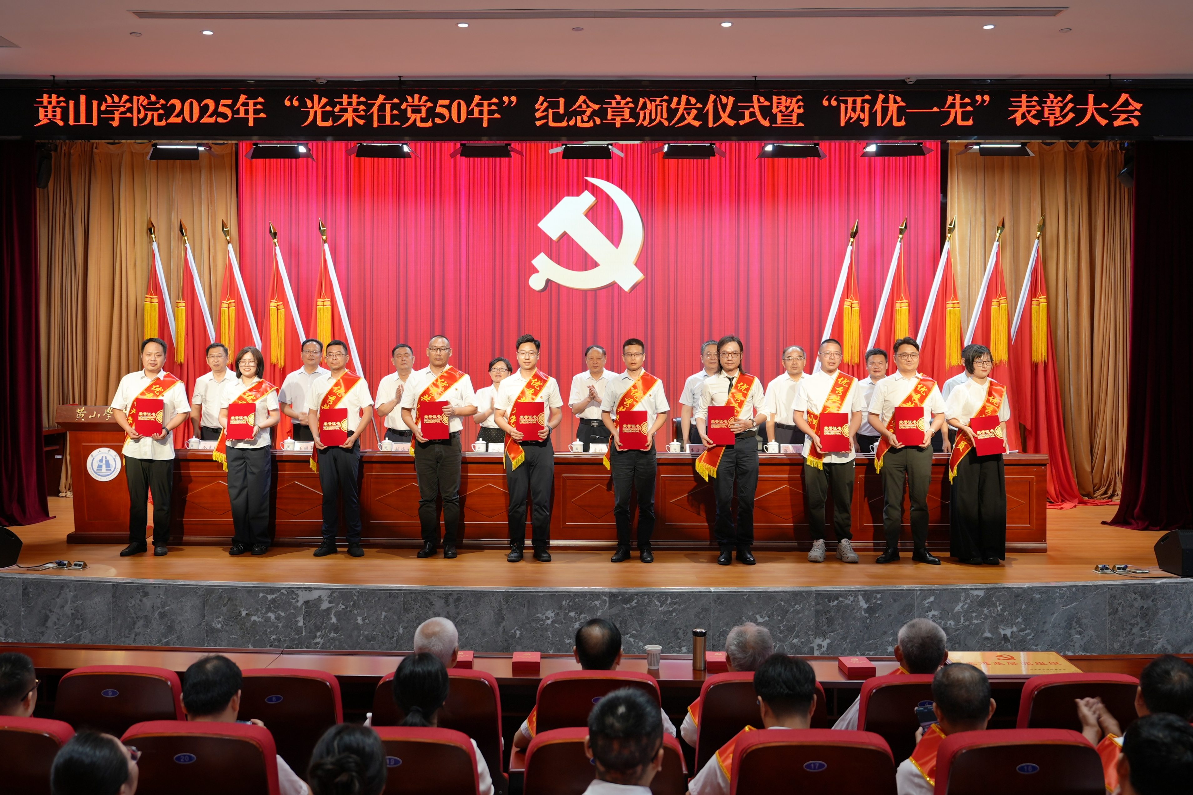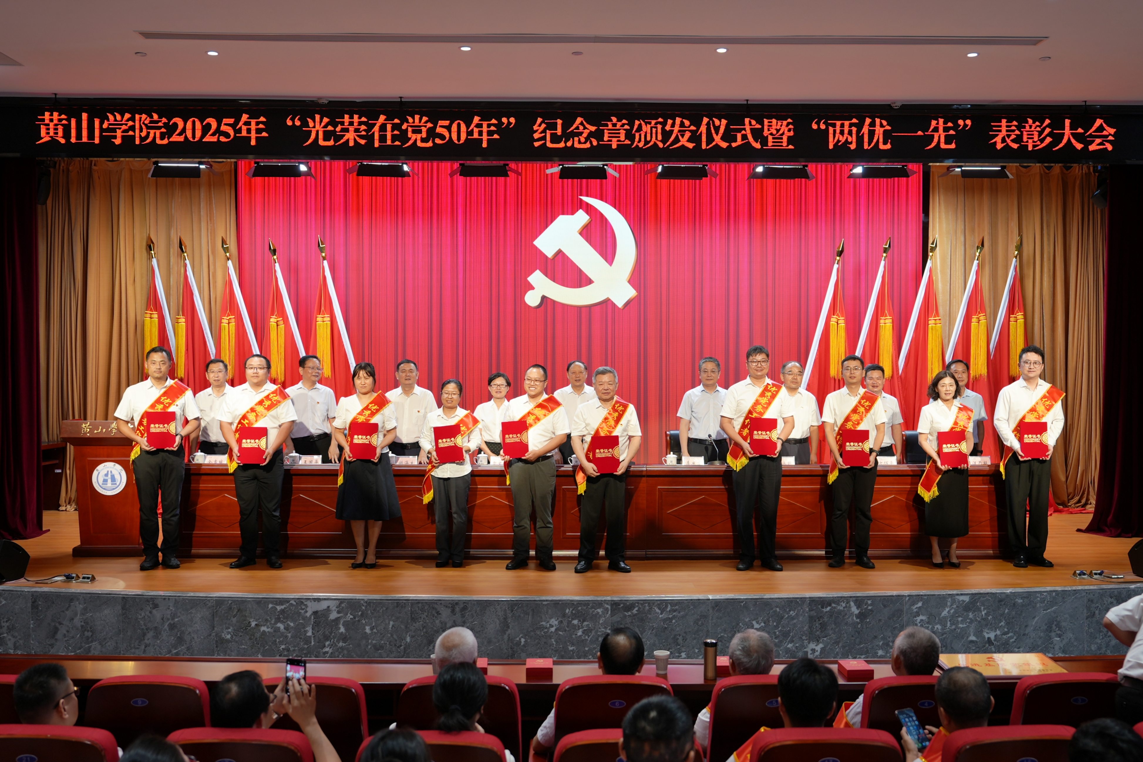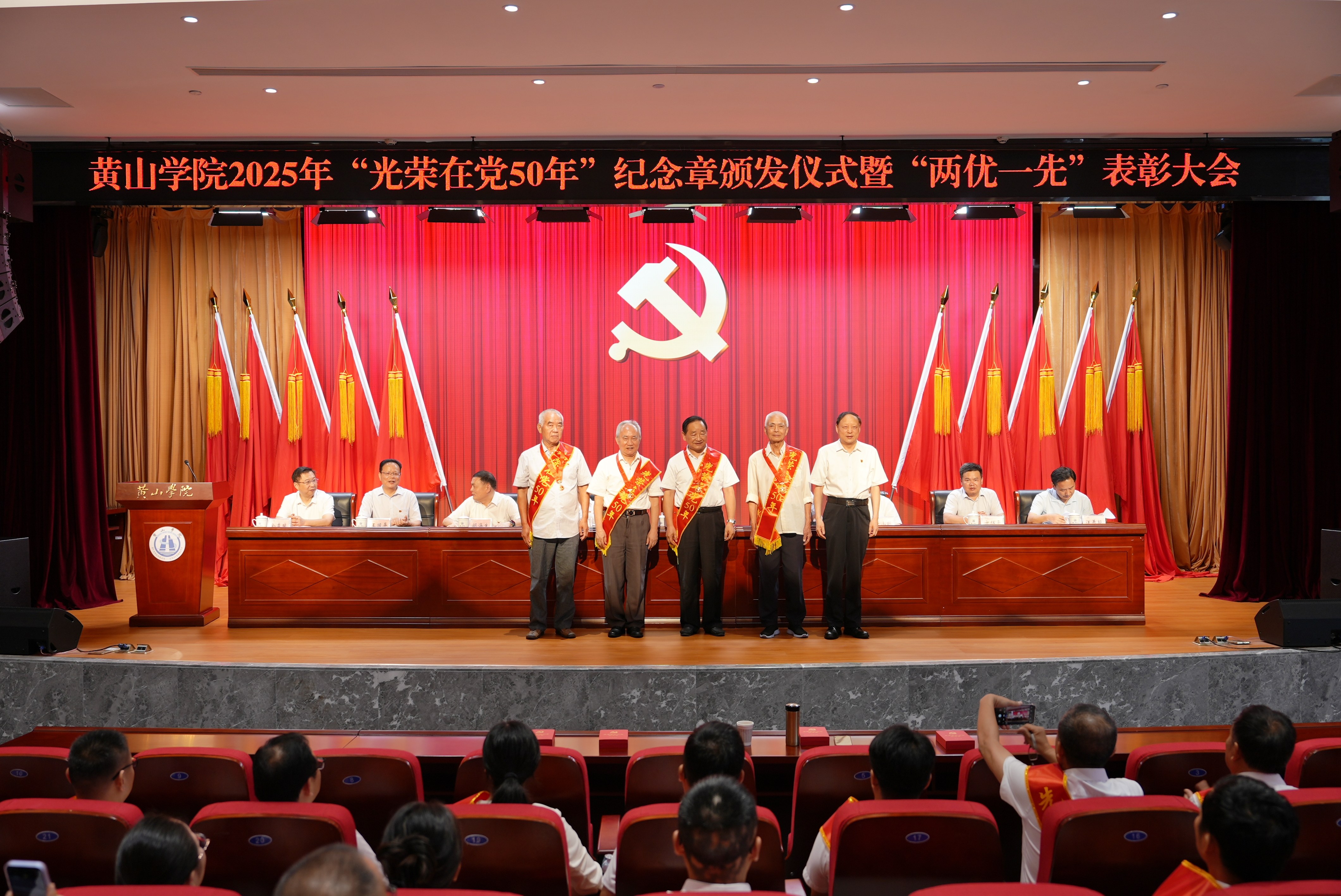 初心如磐志不渝,革命薪火永相传。6月30日下午,学校庆祝中国共产党成立104周年“光荣在党50年”纪念章颁发仪式暨“两优一先”表彰大会在文博楼二楼报告厅举行。校党委班子成员,全体处级干部,“光荣在党50年”纪念章获得者,受表彰的基层党组织负责人、优秀共产党员、优秀党务工作者,各分党委(党总支)委员、党支部书记、专职组织员及党员代表300余人参加会议。大会由校党委副书记、院长李庆宏主持。