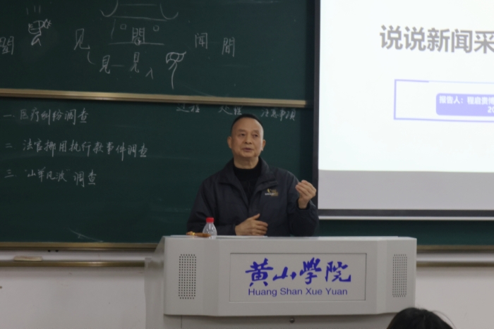 报告会上,程启贵以汉字“闻”的繁体及其化形为切入点,从新闻的定义出发,强调新闻工作不能仅依赖“听”,更要注重“看”与“调查”。讲座过程中,程启贵向同学们详细介绍了他在参与“医疗纠纷调查”“法官挪用执行款事件调查”和“山羊风波调查”事件中暗访的经历,深入讲解了不同场景下的采访策略与问题处理方法,阐述了新闻监督功能对社会发展的重要影响,并就采访中如何揭示事件真相及应对挑战展开讨论。他指出,在调查性报道工作中,新闻工作者自身安全保障、法律知识储备、采访环节问题设计与把控至关重要。