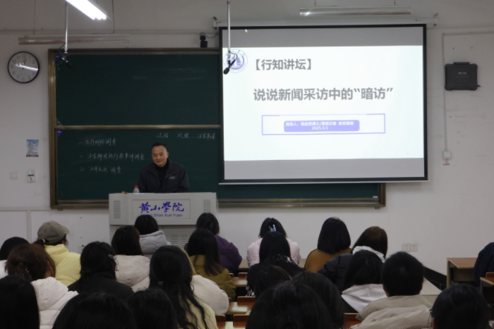 3月5日下午,行知讲坛第216讲在率水校区文渊楼1301教室举行。新安晚报高级记者程启贵博士应邀作题为《说说新闻采访中的“暗访”》主题报告。文化与传播学院近百名师生参加报告会,报告会由该院副院长吕正兵主持。