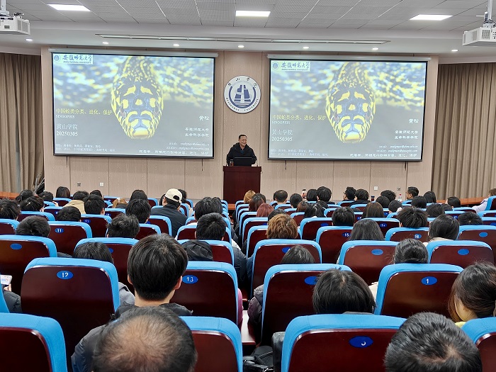 3月5日,我校在率水校区文端楼一楼报告厅举办 “生命之光”科学家讲坛第8讲。安徽师范大学黄松教授应邀作题为“中国蛇类分类、进化与保护”的学术报告。讲坛由生命与环境科学学院党委书记吕顺清主持,生物科学和生物技术专业300余学生和生物科学教研室教师参加。