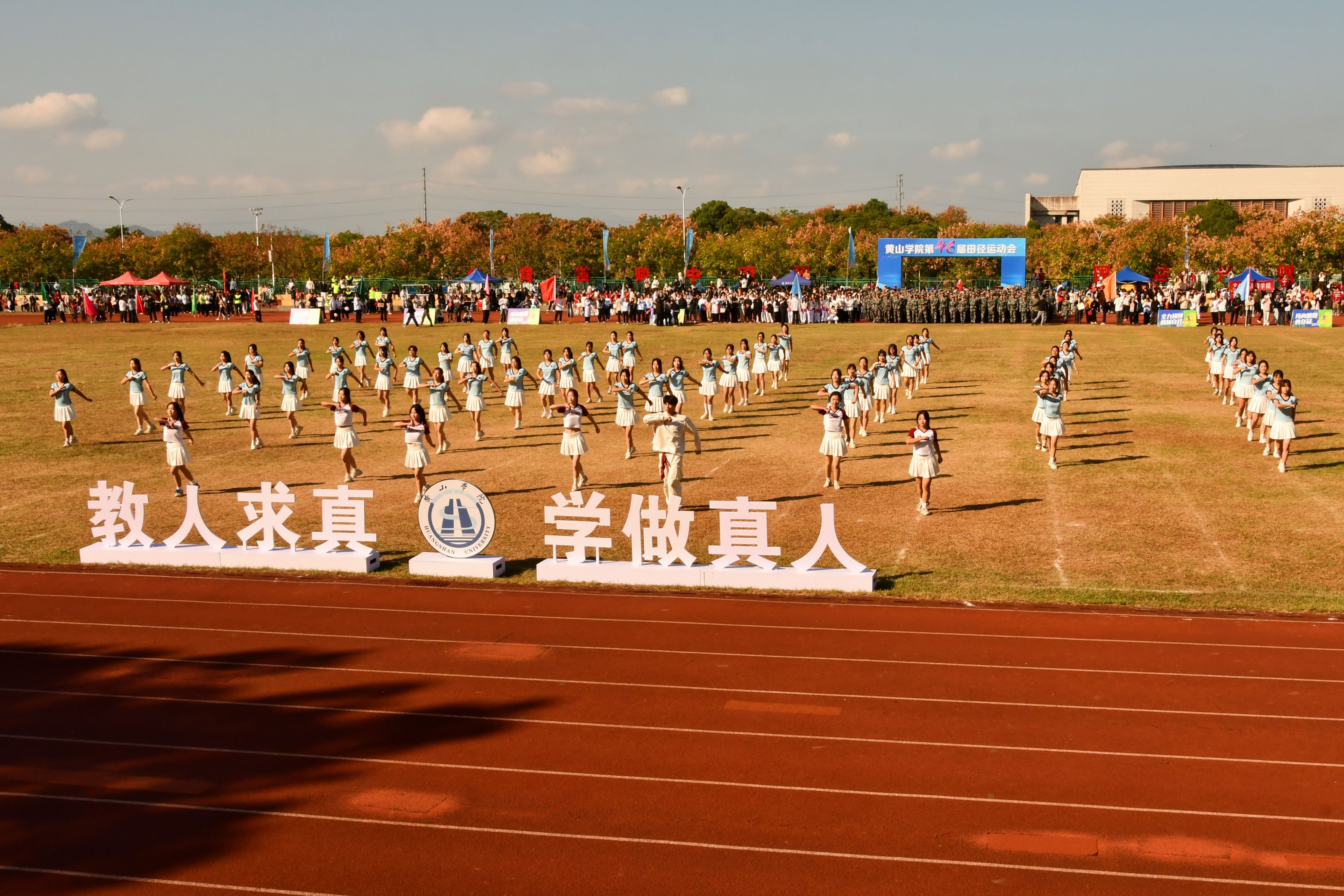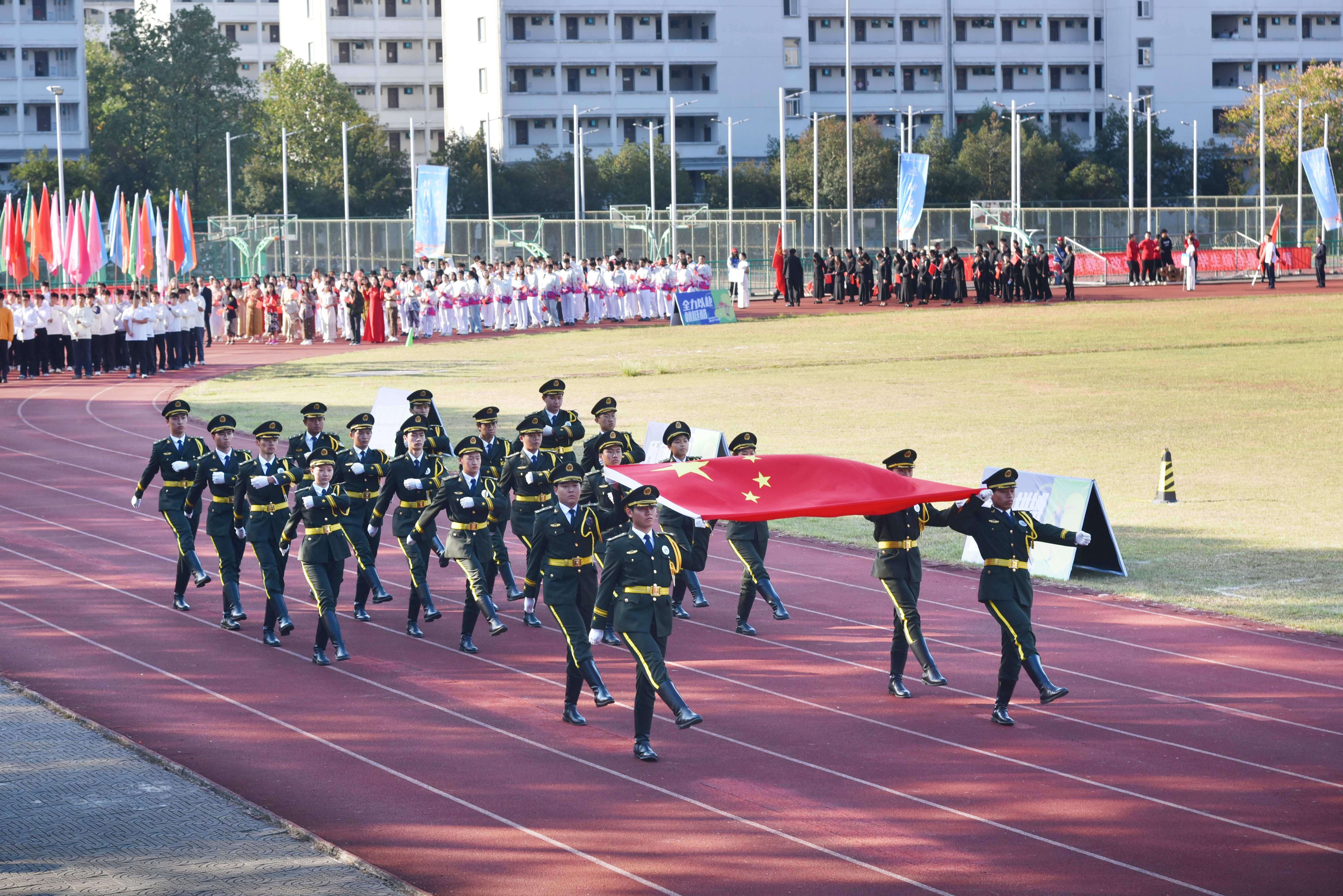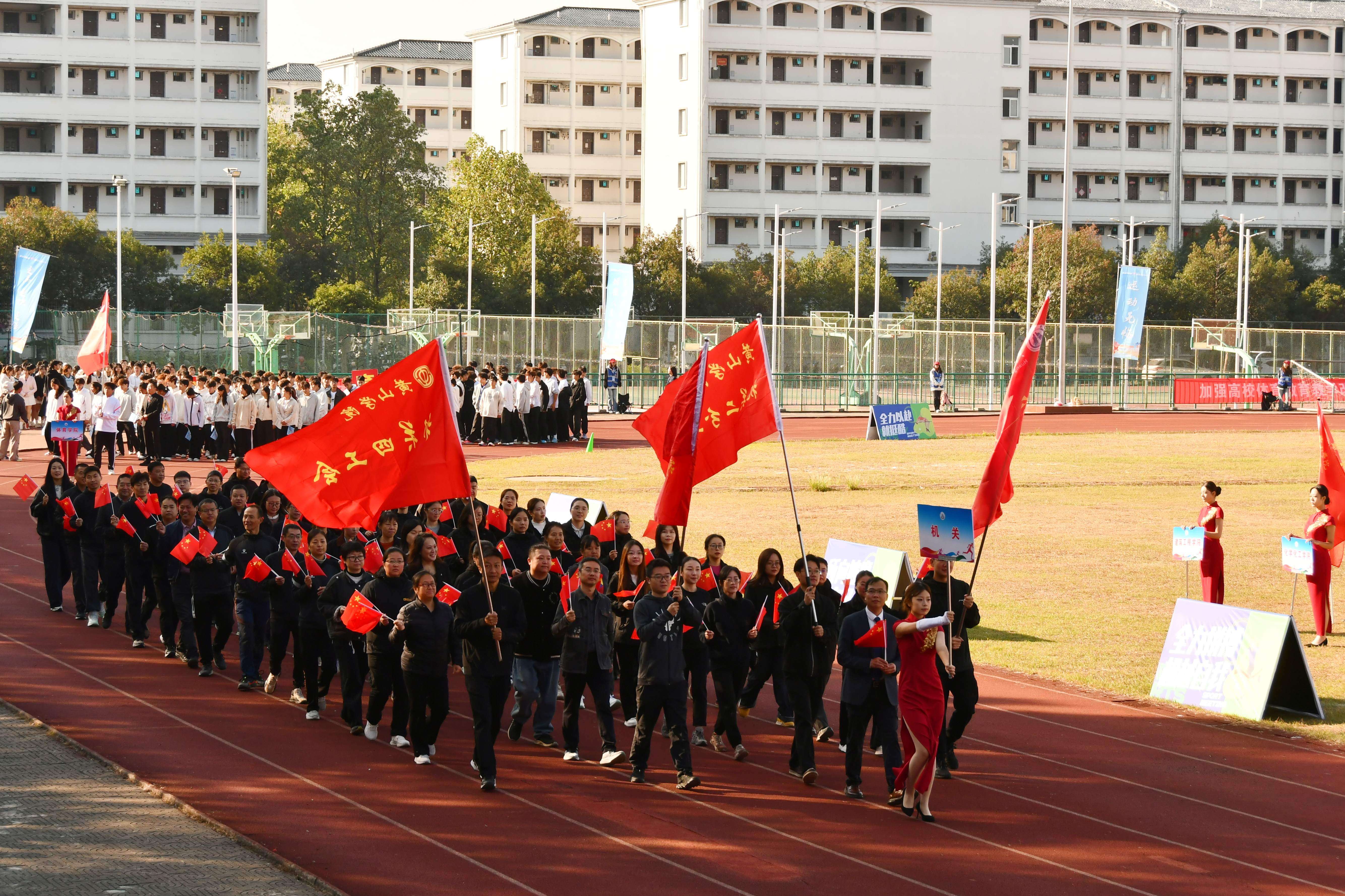 秋高气爽盈校园,彩旗猎猎映朝阳。10月23日上午,我校第46届田径运动会在率水校区第一田径场开幕。校领导李庆宏、刘力、张小明、胡海生、方辉平,黄山市体育局党组书记、局长宣红燕出席开幕式。校体委副主任、校体委各组成部门的主要负责人、各学院书记参加开幕式并在主席台就座。开幕式由校党委委员、副院长张小明主持。