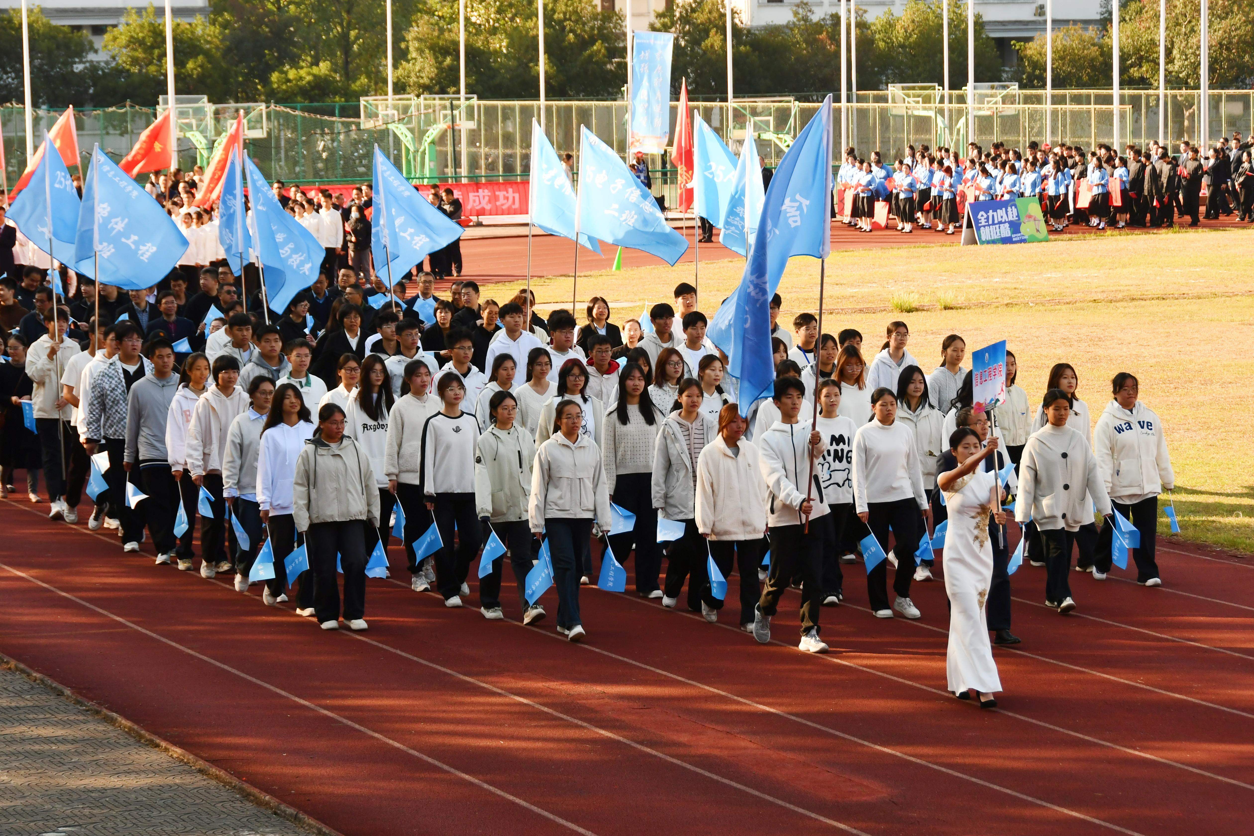 上午8时20分,《运动员进行曲》雄壮奏响,开幕式入场环节正式开启。国旗、校旗、会旗及标语牌方阵率先经过主席台,拉开了方阵展示的序幕。在彩旗队的引领下,17支由各学院师生、部门教职工组成的运动员方阵,以及体育学院师生组成的裁判员方阵依次亮相。各方阵精神抖擞、迈着整齐的步伐,喊着嘹亮的口号,昂扬走过主席台。方阵展示中,既有凸显专业特色的创意编排,又有融合传统文化与时代元素的精彩演绎,充分展现了黄山学院学子的青春风采与团队凝聚力。