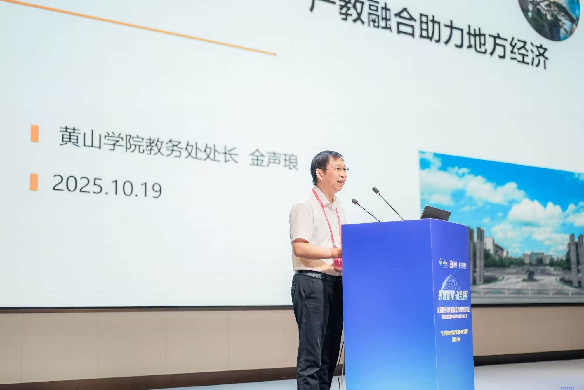 在“应用型高效的数字化转型与范式重构”专题研讨中,我校教务处处长金声琅教授以《数智赋能促进专业建设 产教融合助力地方经济》为题作专题报告,他从制度体系、实践举措、成效成果、后续计划等四个维度,分享了黄山学院在数智赋能与产教融合领域取得的实践成效。