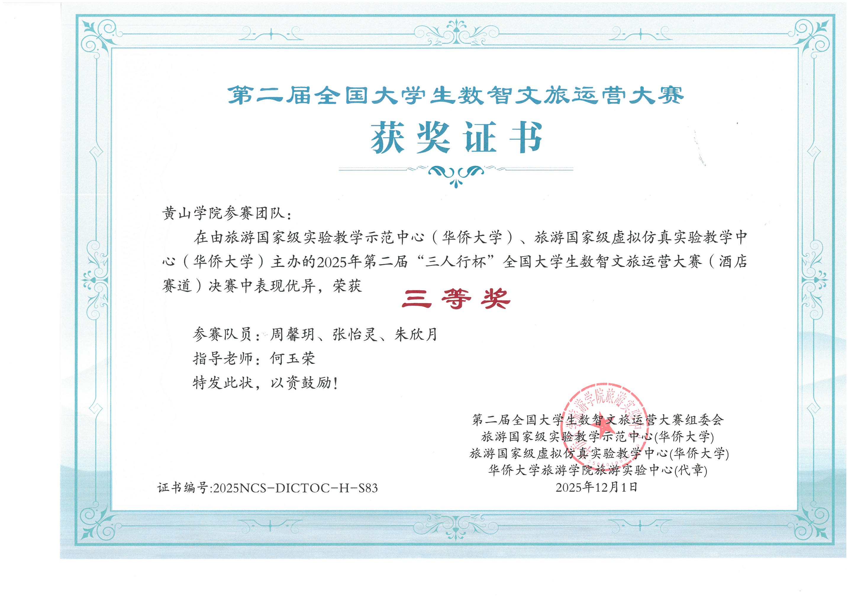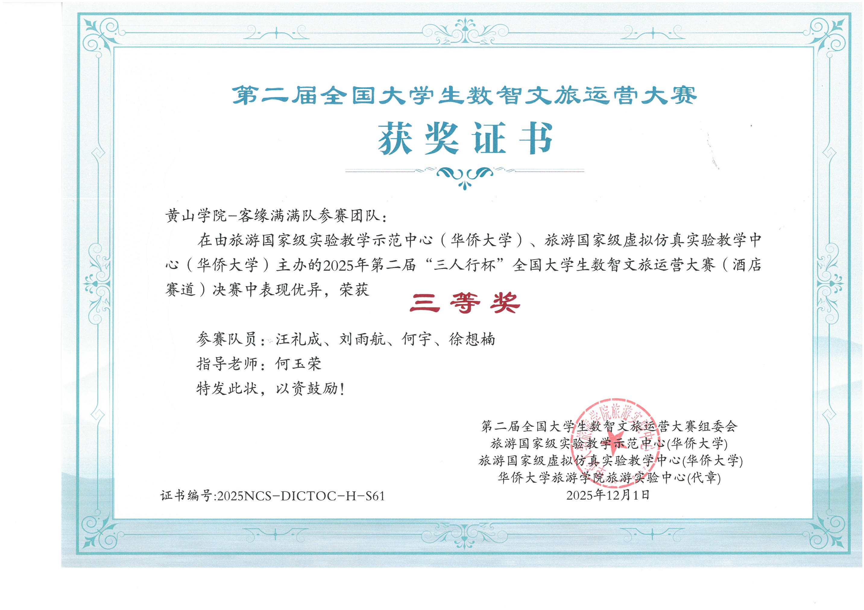 12月2日,我校旅游学院学子在第二届全国大学生数智文旅运营大赛上,获三等奖2项。