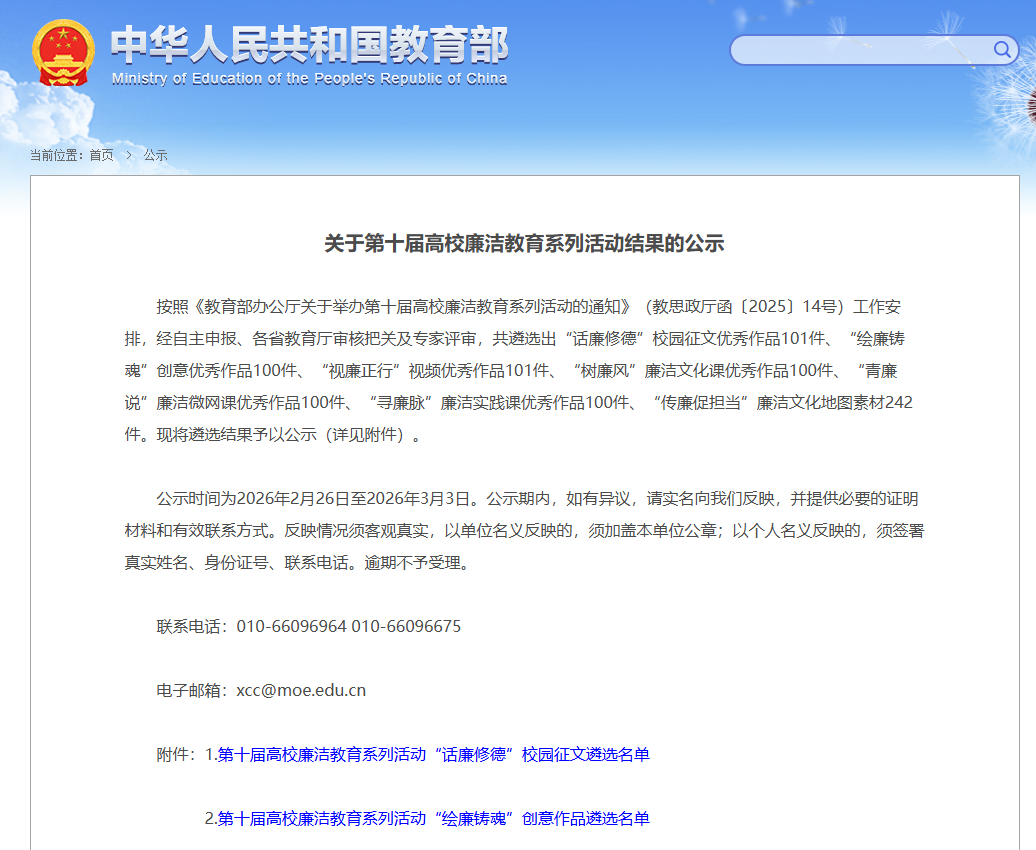 教育部第十届高校廉洁教育系列活动以“清风育德守初心 廉洁笃行担使命”为主题,围绕“学廉、思廉、践廉”三大主线,分“学廉知廉”知识问答、“思廉传廉”作品征集和“践廉守廉”笃行三个单元开展。全国高校思想政治工作网、中国大学生在线、各高校传播矩阵将对入选优秀作品和活动成果进行线上展播。