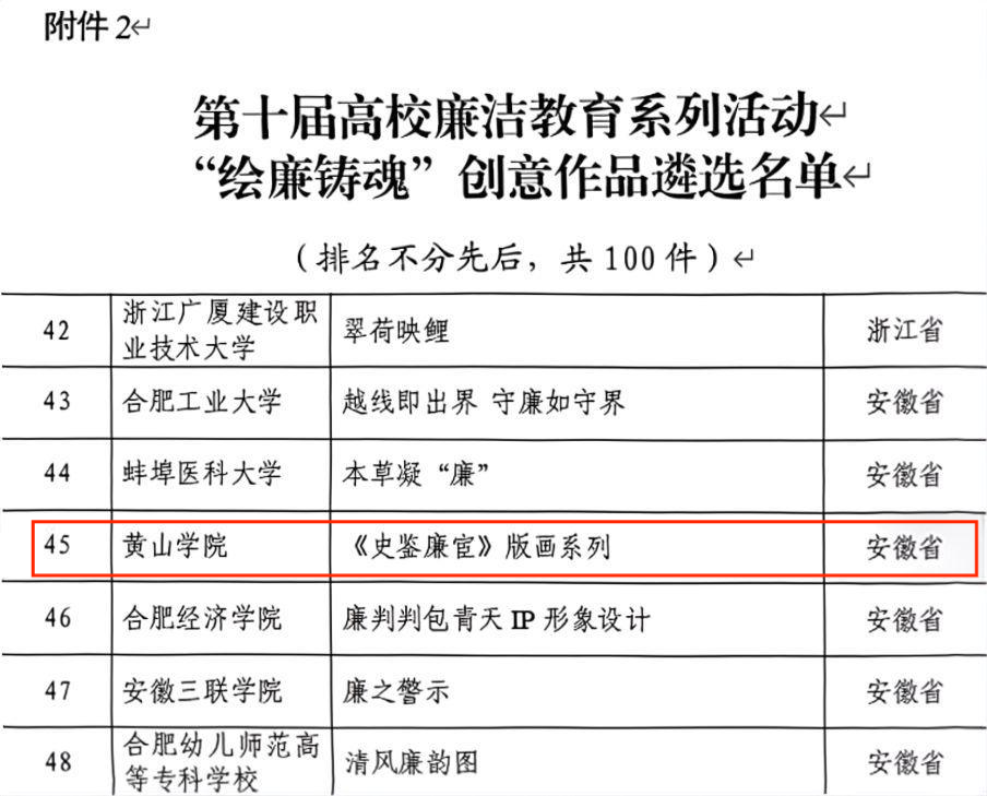 近日,教育部第十届高校廉洁教育系列活动评选结果正式公示,我校艺术学院教师刘丽晶创作的徽派版画系列作品《史鉴廉宦》成功入选“绘廉铸魂”创意作品遴选名单,实现我校在该全国性赛事中的首次突破,为校园廉洁文化建设再添浓墨重彩的一笔。