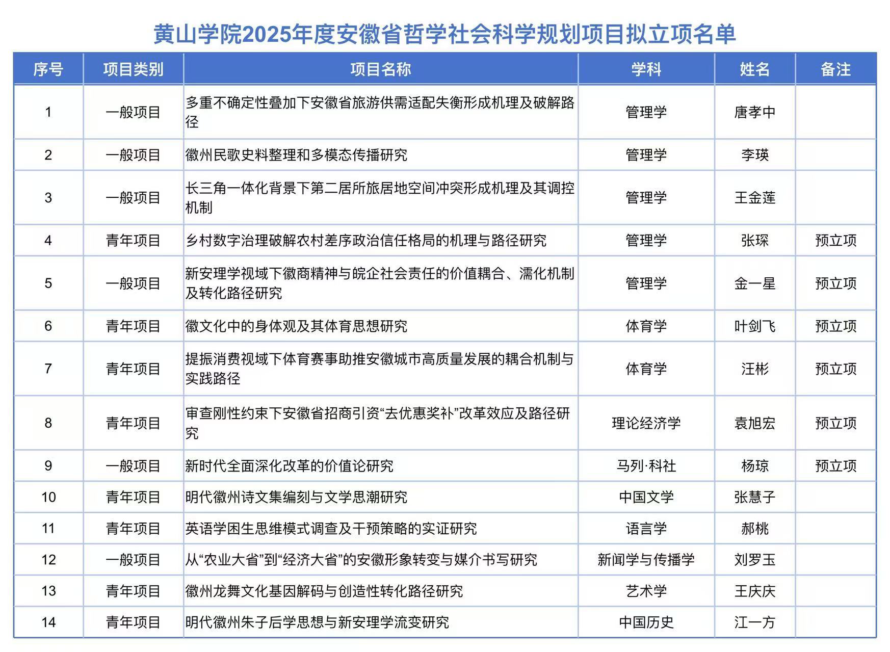 此次获批项目涵盖管理学、体育学、语言学、艺术学等多个学科,既聚焦数字治理、旅游发展、乡村振兴等时代命题,又深耕徽州文化传承、区域发展赋能等地方特色议题,形成“时代性与地域性并重、理论性与实践性兼顾”的多元布局。立项成果中,青年项目占比显著,充分彰显了我校青年科研队伍的创新活力与发展潜力,也印证了学校“有组织科研”培育模式的显著成效。