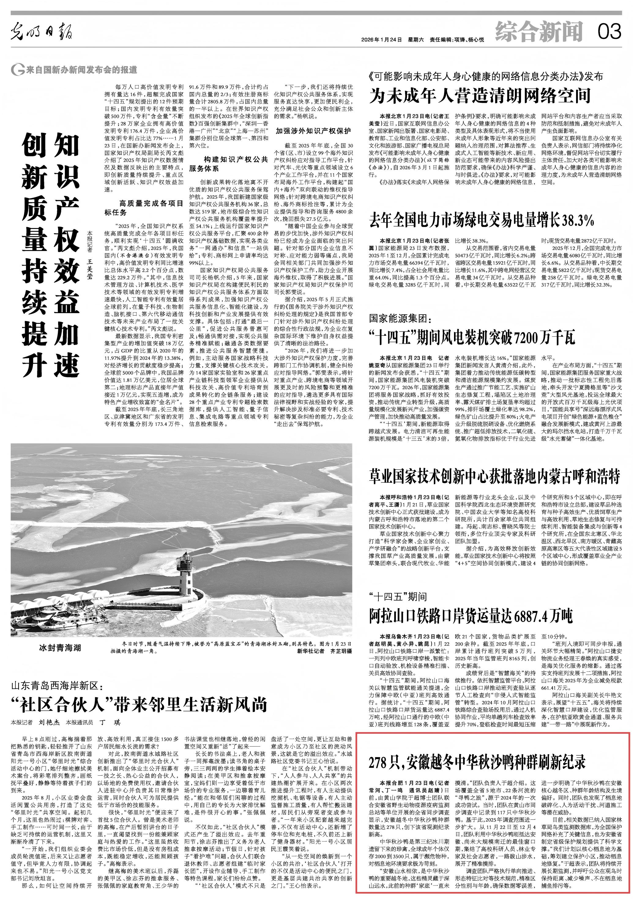 1月24日,《光明日报》以“278只,安徽越冬中华秋沙鸭种群刷新纪录”为题,报道我校于超博士团队牵头开展的安徽省越冬中华秋沙鸭全省同步调查成果。人民网、新华网、光明网、腾讯网、新浪网、搜狐网、中国教育在线及《安徽日报》、中安在线、安徽教育网、安青网等多家主流媒体关注报道。